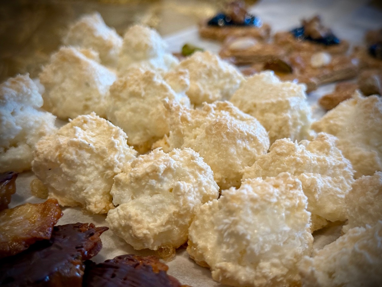 Šľahačku, múku a cukor povaríme na kašu asi 1 min. Pridáme mandľové lupienky a kandiz. ovocie. Na plech s papierom na pečenie dvomi lyžičkami tvoríme kopčeky. Prstami dotvoríme placky. Prsty si namáčame do vody aby sa nelepili. Pečieme pri